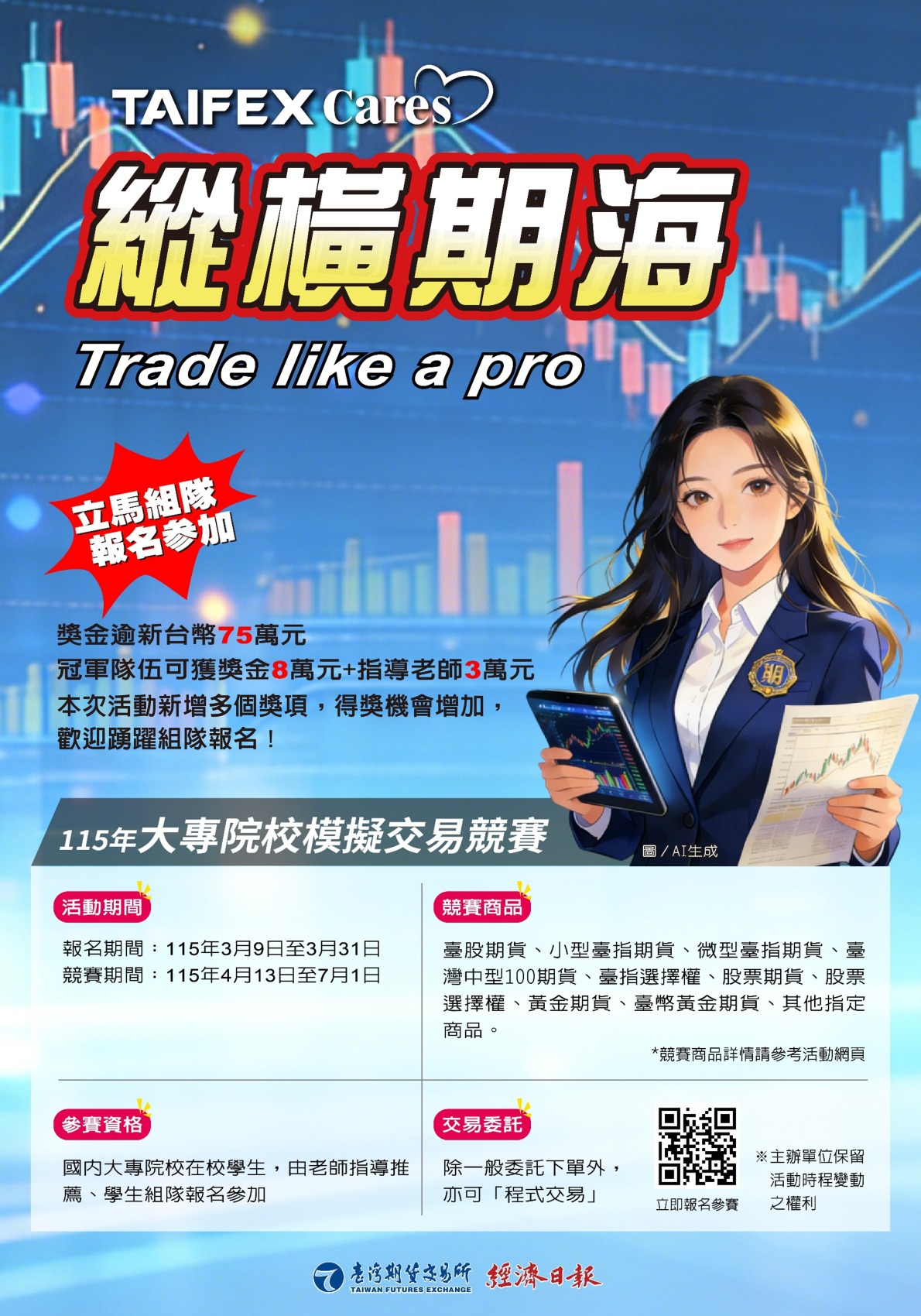 臺灣期貨交易所為推廣期貨市場教育並培育校園金融人才,與經濟日報共同舉辦「115年縱橫期海 Trade Like a Pro-大專院校模擬交易競賽」,本活動透過模擬交易方式,讓學生體驗期貨交易實務,並培養風險管理與交易分析能力,歡迎有興趣的同學踴躍報名參加。